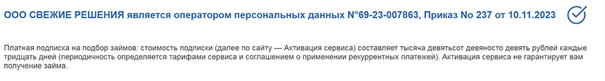 Компания «Свежие решения» предоставляет услуги по подбору микрокредитных программ для физических лиц на платной основе. На сайте Easy Cash Pro доступна форма для отправки заявления. Брокер не является кредитором, а принимает заявки и передает их в МФО после автоматического анализа. Плата за услугу регулярно удерживается с банковской карты, но не является гарантией одобрения. Чтобы отписаться от платных опций Легкие деньги, используйте инструкцию ниже.